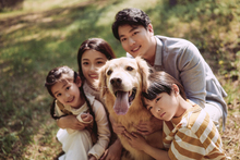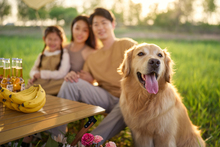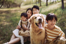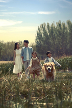 图片标题: 夕阳下父女与狗