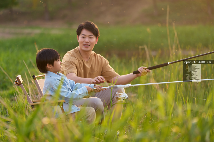 图片标题: 父子田野湖边垂钓郊游