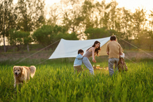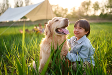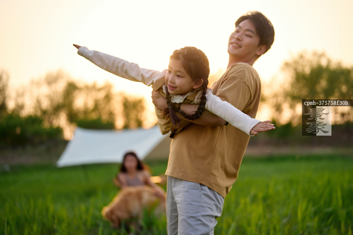 图片标题: 夕阳下父女与狗