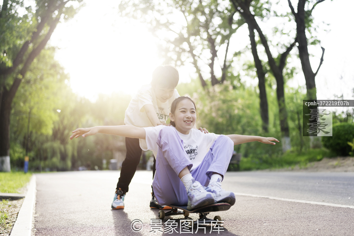 图片标题: 快乐的孩子们在公园玩滑板