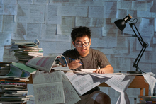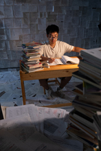 图片标题: 疲惫的学生在浩瀚的书海中写作业