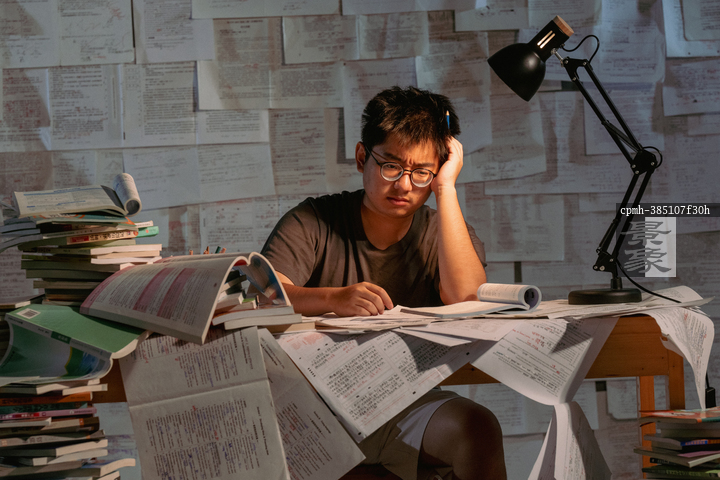 图片标题:     疲惫的学生在浩瀚的书海中写作业
