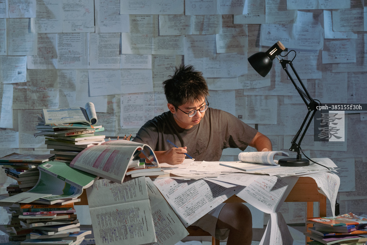 图片标题: 疲惫的学生在浩瀚的书海中写作业