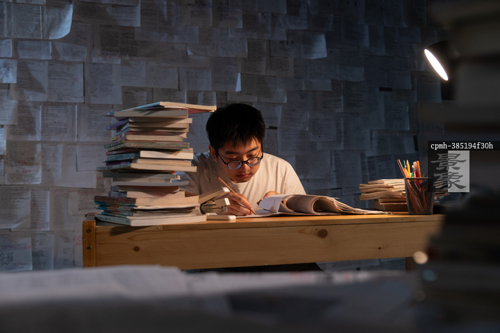 图片标题: 疲惫的学生在浩瀚的书海中写作业