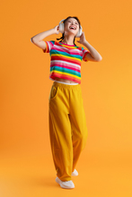 图片标题: 红色背景下的一位快乐青年女人