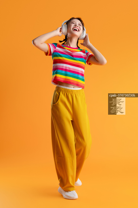 图片标题: 快乐的青年女人戴着耳机听音乐
