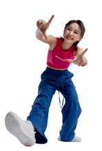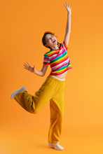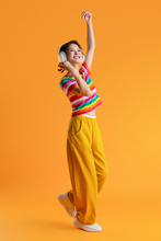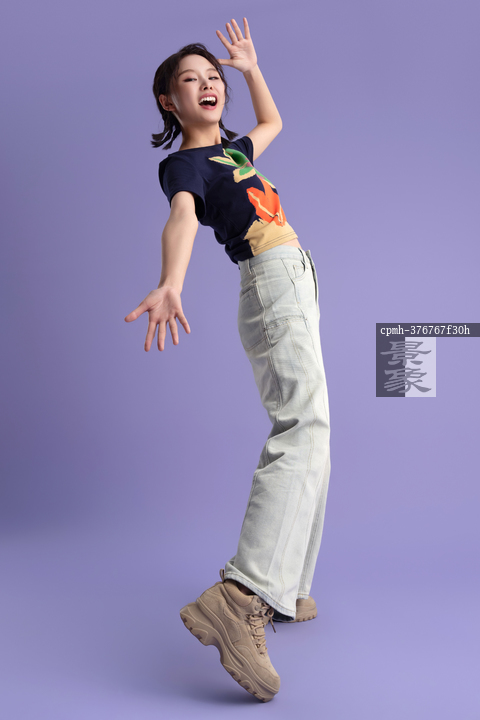 图片标题: 紫色背景下的快乐青年女人