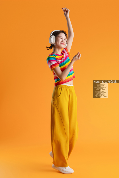图片标题: 快乐的青年女人戴着耳机听音乐