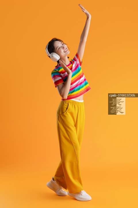 图片标题: 快乐的青年女人戴着耳机听音乐