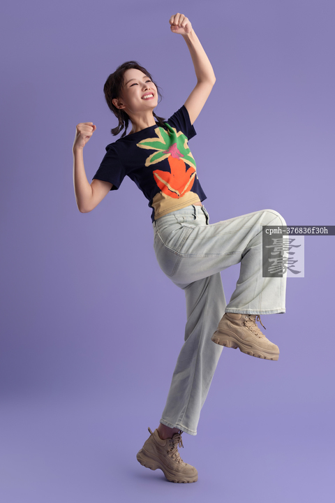 图片标题: 紫色背景下的快乐青年女人
