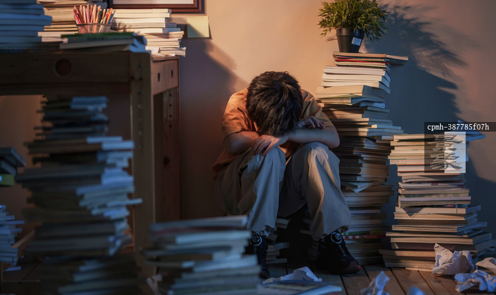 图片标题: 书堆中压力巨大的少年