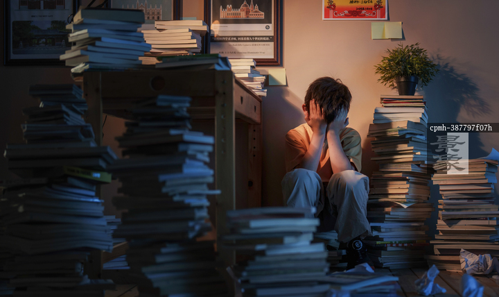 图片标题: 书堆中压力巨大的少年