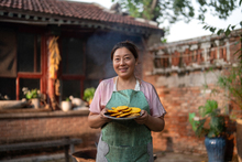 图片标题: 一位农妇做饭招待客人用餐