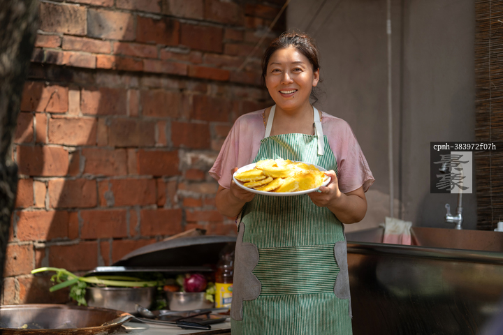 图片标题: 在做饭的一位中年女人高兴的展示食物