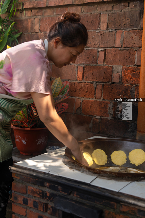 图片标题: 乡村的一位中年女人在院子里做饭