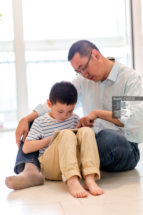 图片标题: 父子两人坐在地上玩平板电脑