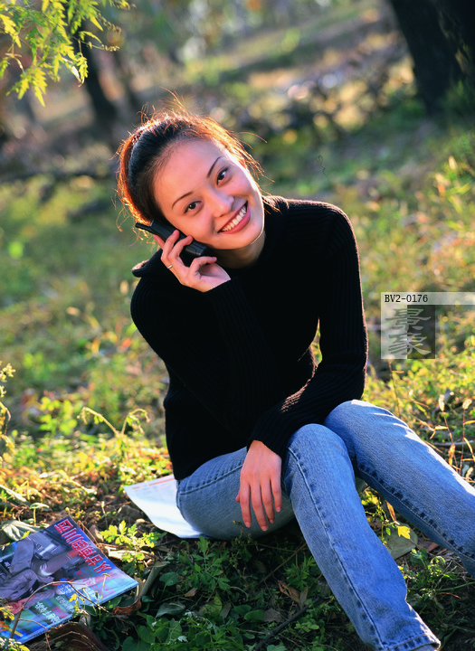 图片标题: 东方女人在户外坐着打电话