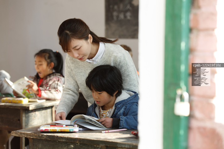 图片标题: 乡村女教师和小学生在教室里