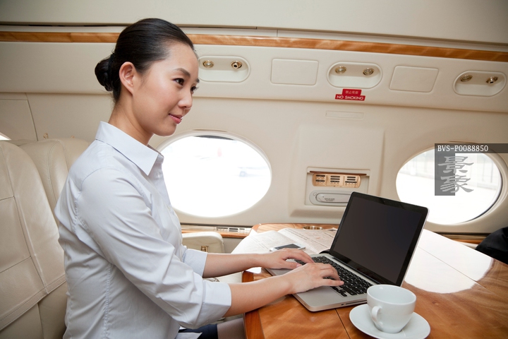 图片标题: 商务女士在私人飞机上办公