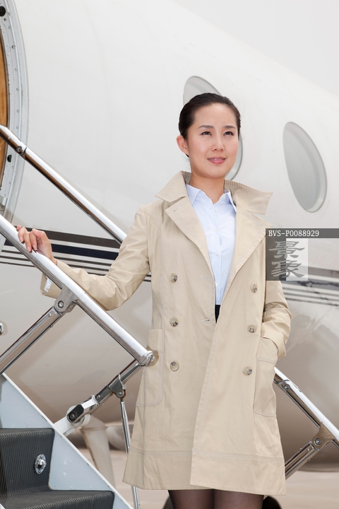 图片标题:     商务女士站在私人飞机悬梯上