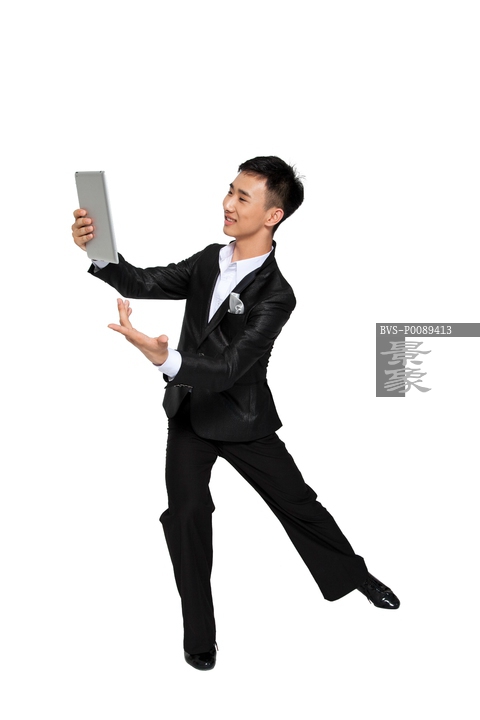 图片标题: 棚拍年轻男人拿着ipad跳舞
