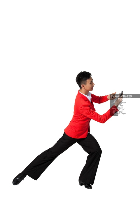 图片标题: 棚拍穿红色西装的年轻男人拿着手机跳舞