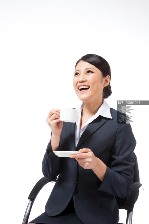 图片标题: 棚拍年轻商务女士坐在办公椅上喝咖啡