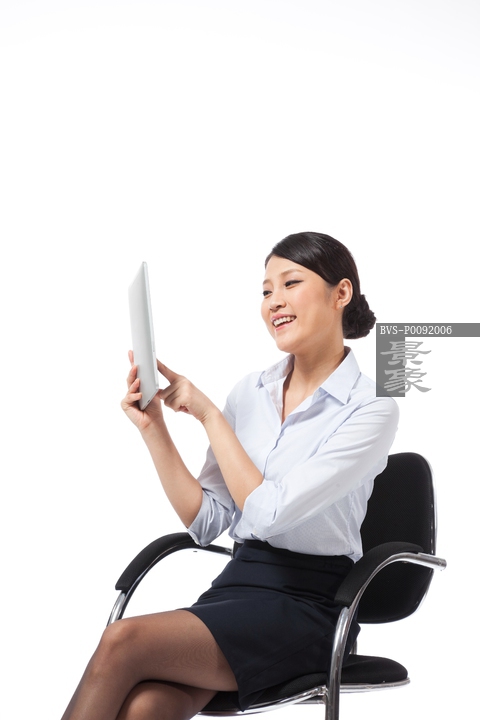 图片标题: 棚拍年轻商务女士坐在办公椅上使用平板电脑
