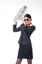 图片标题: 棚拍年轻商务女士和手提箱