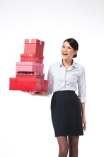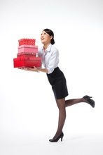 图片标题: 棚拍年轻商务女士抱着礼物盒