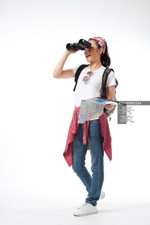 图片标题: 棚拍年轻女人户外旅行拿着望远镜
