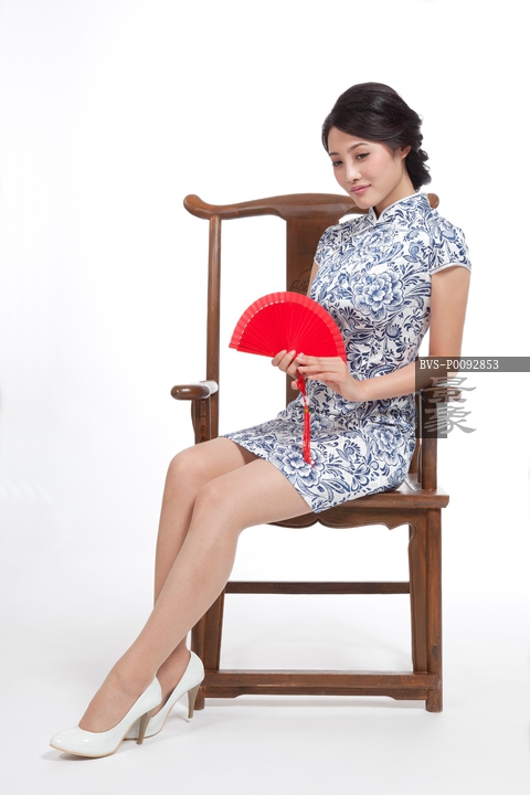 图片标题: 棚拍身穿旗袍的年轻女人坐中式椅