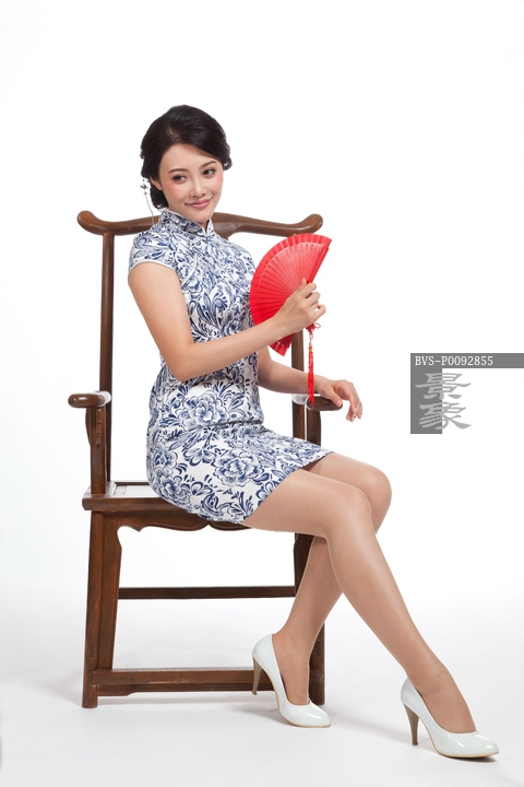 图片标题: 棚拍身穿旗袍的年轻女人坐中式椅