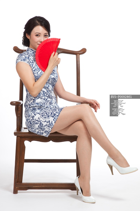 图片标题: 棚拍身穿旗袍的年轻女人坐中式椅
