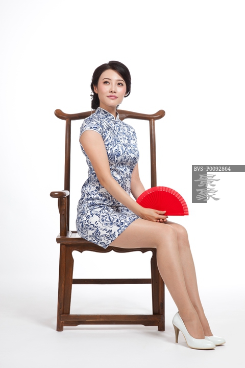 图片标题: 棚拍身穿旗袍的年轻女人坐中式椅