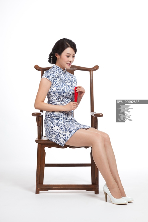 图片标题: 棚拍身穿旗袍的年轻女人坐中式椅
