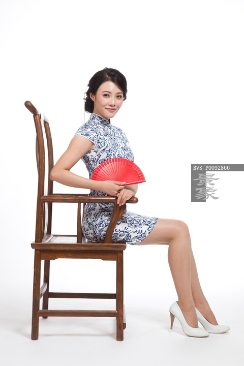 图片标题: 棚拍身穿旗袍的年轻女人坐中式椅