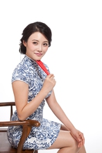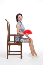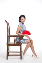 图片标题: 棚拍身穿旗袍的年轻女人坐中式椅