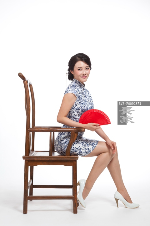 图片标题: 棚拍身穿旗袍的年轻女人坐中式椅