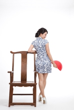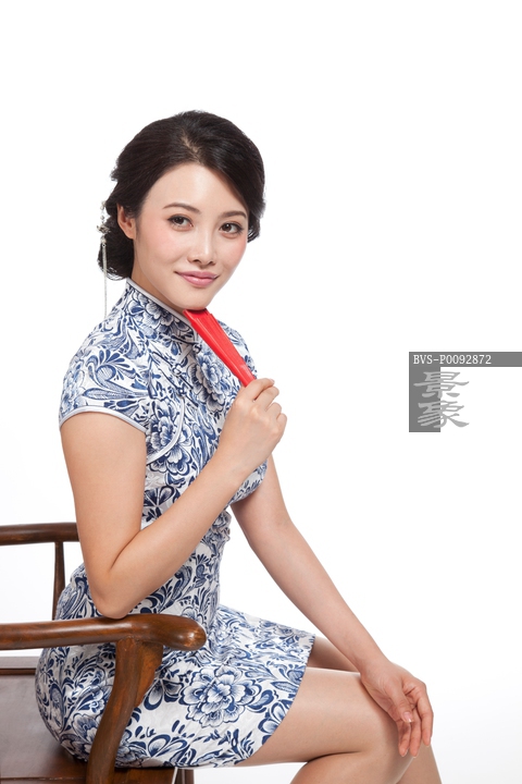 图片标题: 棚拍身穿旗袍的年轻女人坐中式椅