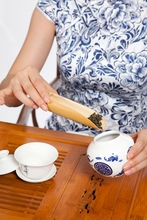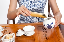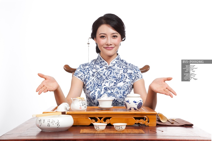 图片标题: 棚拍身穿旗袍的年轻女人茶艺表演