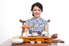 图片标题: 棚拍身穿旗袍的年轻女人茶艺表演