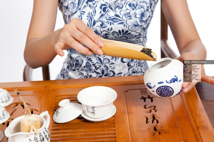 图片标题:     棚拍身穿旗袍的年轻女人茶艺表演
