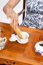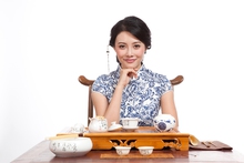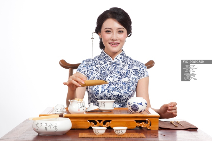 图片标题: 棚拍身穿旗袍的年轻女人茶艺表演