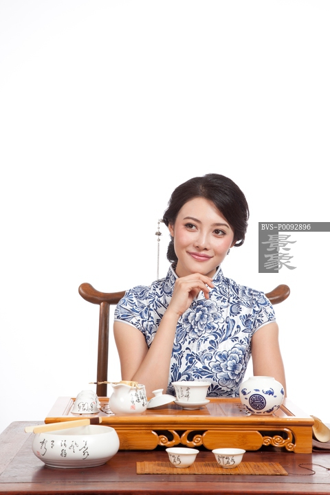 图片标题:     棚拍身穿旗袍的年轻女人茶艺表演