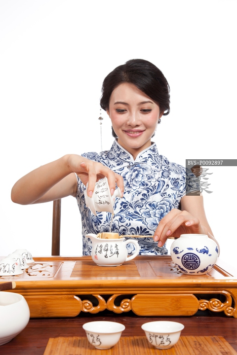 图片标题:     棚拍身穿旗袍的年轻女人茶艺表演