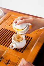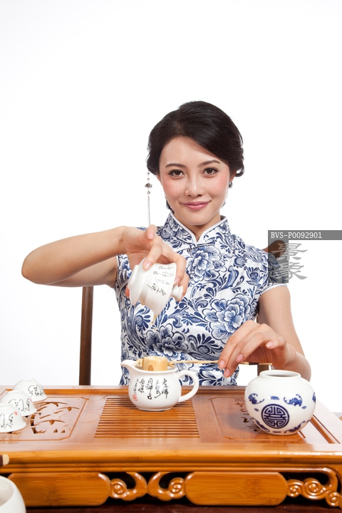 图片标题:     棚拍身穿旗袍的年轻女人茶艺表演