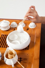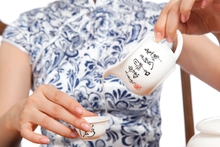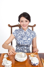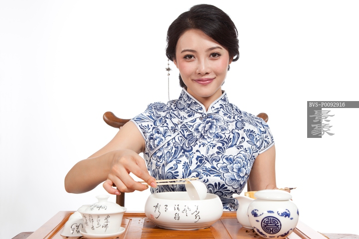 图片标题: 棚拍身穿旗袍的年轻女人茶艺表演