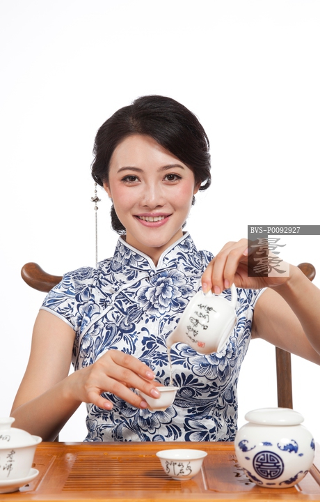 图片标题: 棚拍身穿旗袍的年轻女人茶艺表演