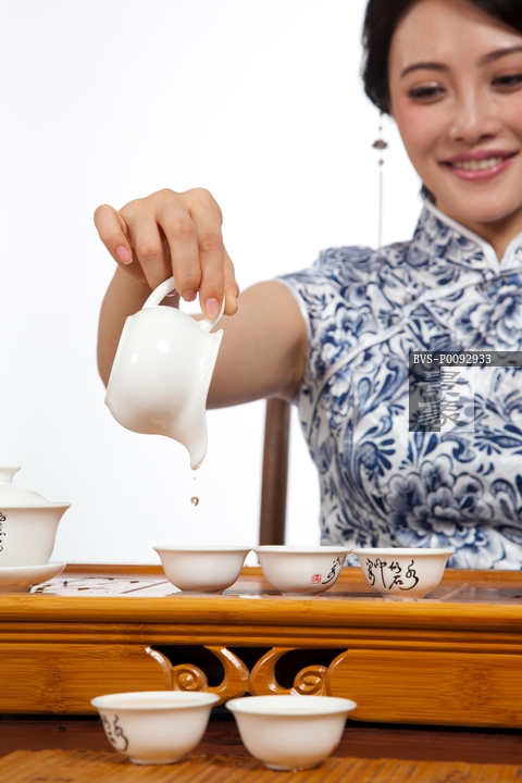 图片标题: 棚拍身穿旗袍的年轻女人茶艺表演